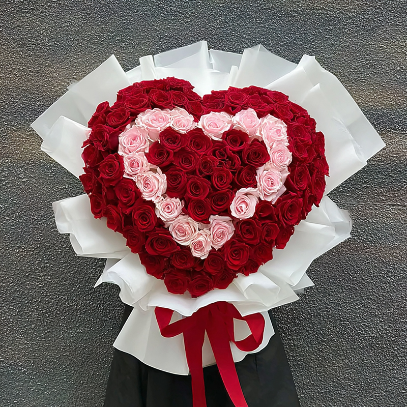 This bouquet is a poetic painting made tangible by love. Red roses blaze like passionate flames, while pink roses whisper with gentle tenderness — together tracing the outline of a heart, as if all affection has bloomed into this heart-shaped flourish. White wrapping paper, like a cloud’s soft garment, enfolds the fragrant warmth, and a red ribbon ties a knot of deep sentiment, quietly declaring: “With my heart as the letter, I gift you the entire romantic universe.” The moment eyes meet it, they fall into a swirl of red and pink, with even the air sweetened — the most tender embodiment of love.